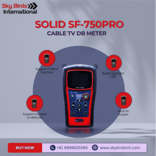 The SOLID SF-750PRO is a professional-grade digital meter designed specifically for measuring and analyzing signals in DVB-C (Digital Video Broadcasting - Cable) networks. It is a compact, handheld device used by cable TV technicians to ensure high signal quality and efficient system installation.