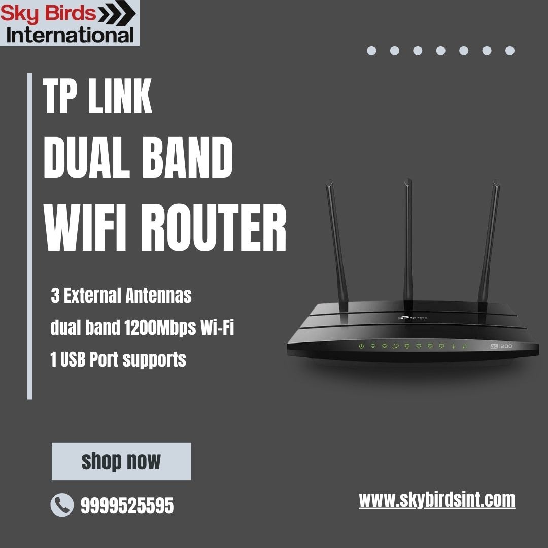 The TP-Link Dual Band WiFi Router you see in the picture is a top-notch networking device that promises reliable and speedy internet connectivity. With three external antennas, it provides wider coverage and a stronger signal throughout your home or office. This router supports dual-band WiFi, reaching speeds of up to 1200Mbps, which means you can enjoy smooth streaming, online gaming, and web browsing on multiple devices all at once. Plus, it comes with a USB port, making it easy to share files, printers, or media across your network. Its sleek and modern design adds a practical yet stylish touch to any setup. If you're interested, you can find it at Sky Birds International—just give them a call at 9999525595 or check out their website at www.skybirdsint.com to shop now.