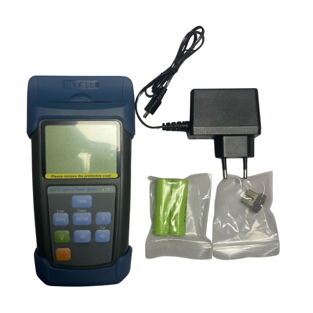 Overview: The AE210 Series of optical power meters is perfect for qualifying applications using fiber optics for the physical layer, including FTTx, CATV, PON, and long haul networks. These user-friendly instruments are capable of supporting up to 9 wavelengths, covering all ranges required for the applications listed above. These handheld units provide superior accuracy, consume little power, and are built for portability in the field. With multiple available models, it's easy to find the right configuration for your testing needs. Key Benefits: • Over 100 hours' working time with 2x AA rechargeable batteries • New features: pair with LS310 Series Light Source to auto-verify source wavelength and run dual-λ testing • Identify fiber bends and faults with VFL function • Auto shutdown and self-calibration • USB interface and Toolbox software